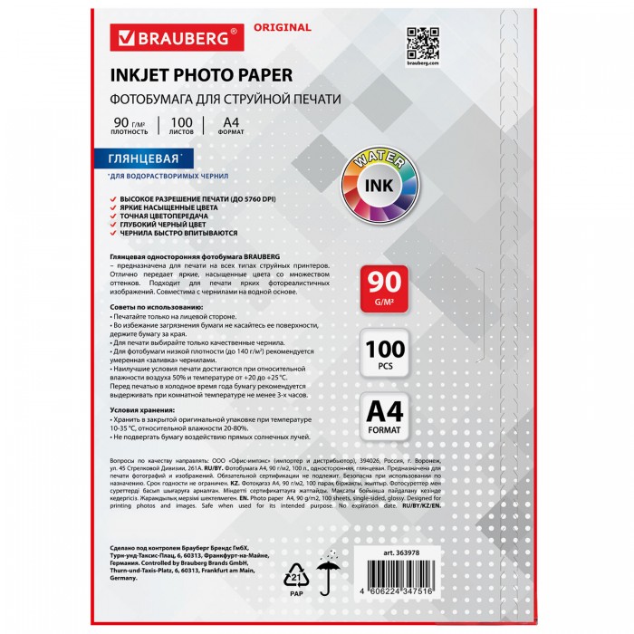 В интернет-магазине AV Group можно купить Фотобумага глянцевая, А4, 90 г/м2, односторонняя, 100 листов, BRAUBERG ORIGINAL, 363978, производитель Китай, артикул 363978 по цене 580 руб. Продаем физическим и юридическим лицам, при условии минимальной суммы заказа (общей суммы в корзине) от 5 тысяч рублей. Возможна доставка курьером по Верхней Пышме, Екатеринбургу и Свердловской области. В регионы отправляем транспортной компанией. Чтобы уточнить необходимое количество товара и дополнительные условия, звоните: 8(800)201-75-47, менеджер вас проконсультирует.