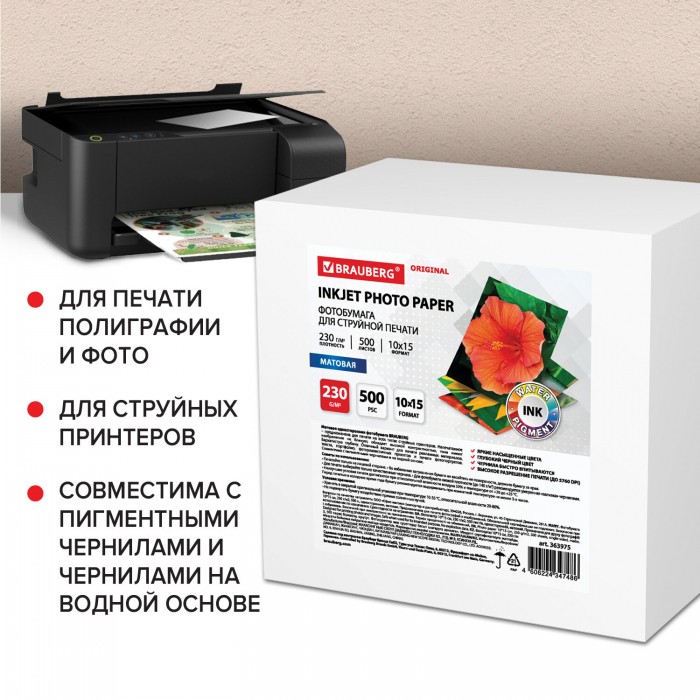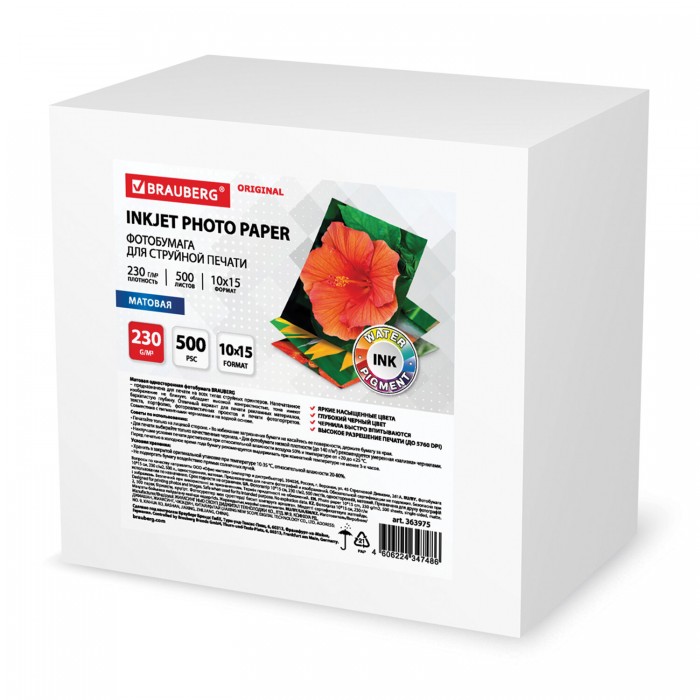 Фотобумага матовая, 10х15 см, 230 г/м2, односторонняя, 500 листов, BRAUBERG ORIGINAL, 363975