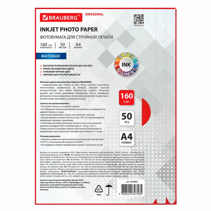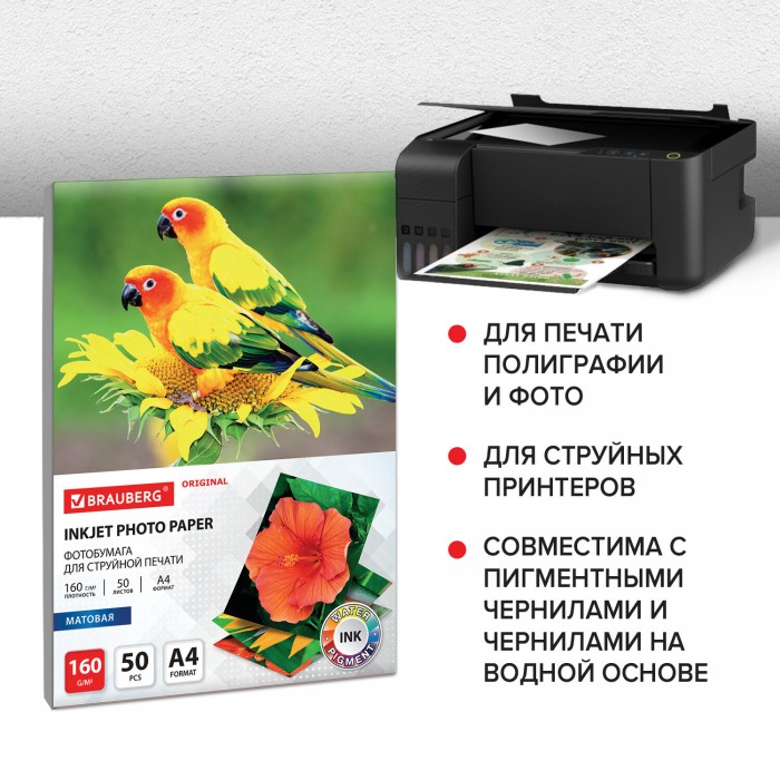 Фотобумага матовая, А4, 160 г/м2, односторонняя, 50 листов, BRAUBERG ORIGINAL, 363985