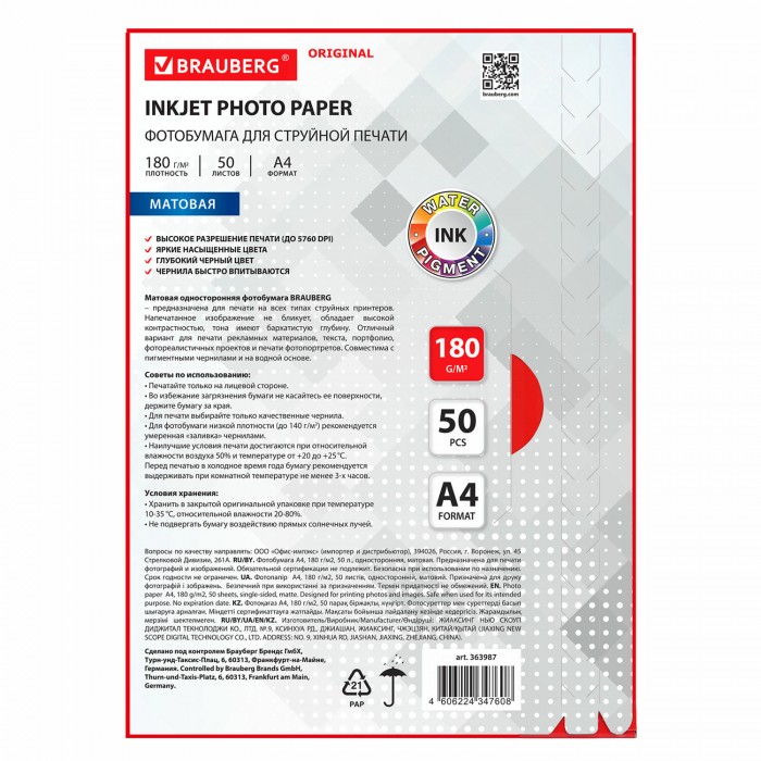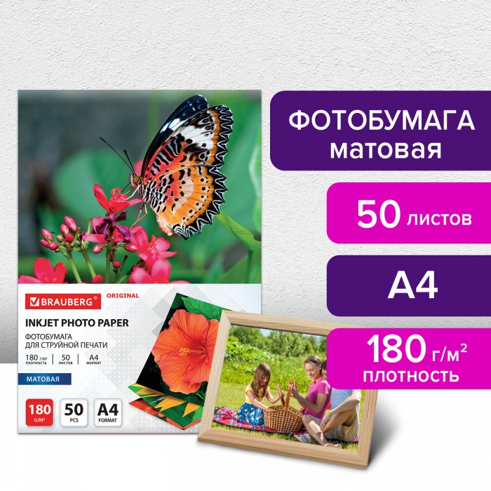 Фотобумага матовая, А4, 180 г/м2, односторонняя, 50 листов, BRAUBERG ORIGINAL, 363987