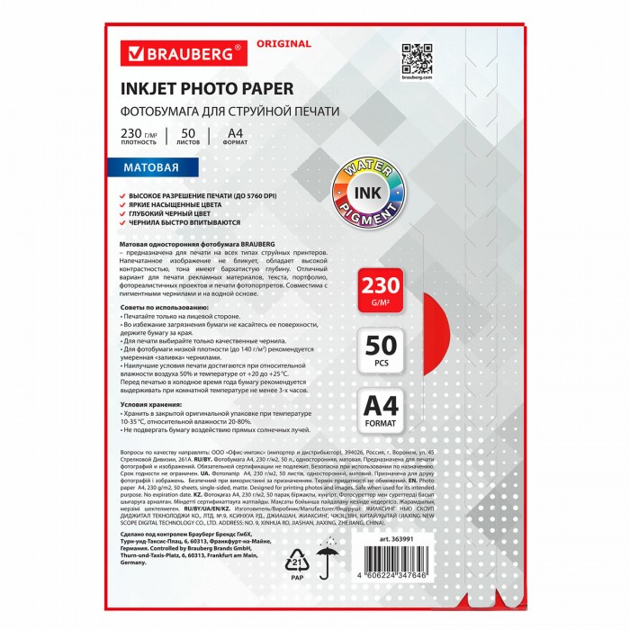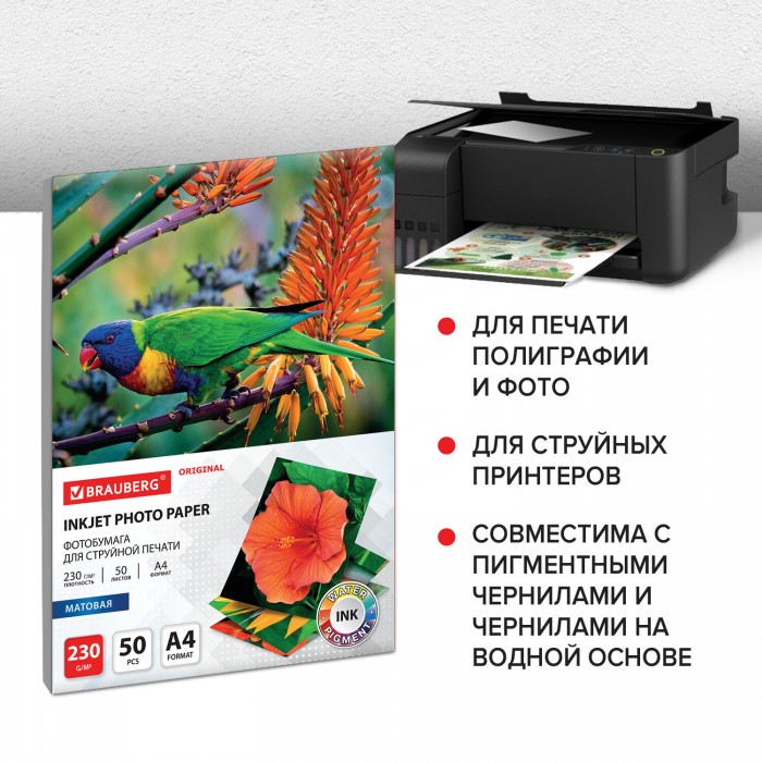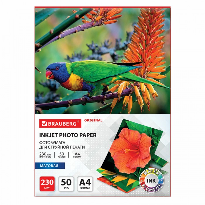 Фотобумага матовая, А4, 230 г/м2, односторонняя, 50 листов, BRAUBERG ORIGINAL, 363991
