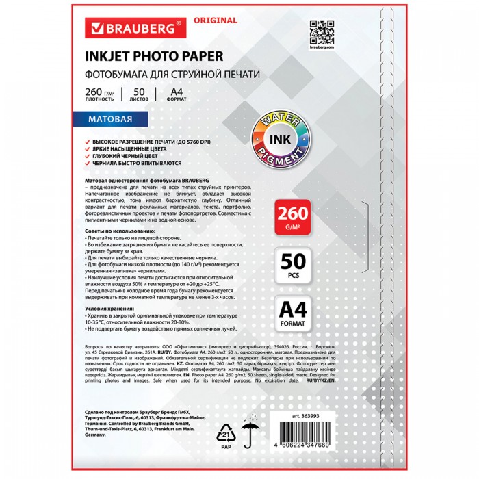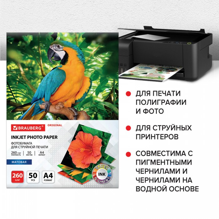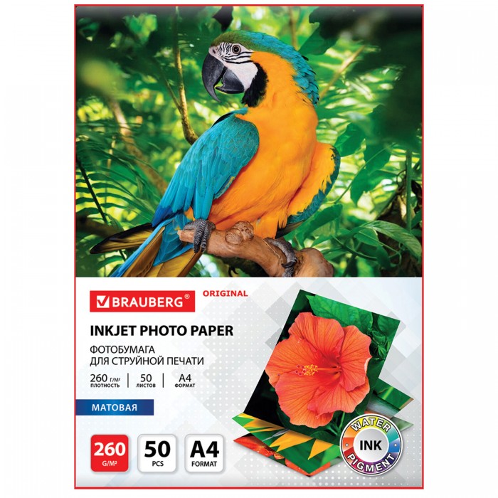 Фотобумага матовая, А4, 260 г/м2, односторонняя, 50 листов, BRAUBERG ORIGINAL, 363993