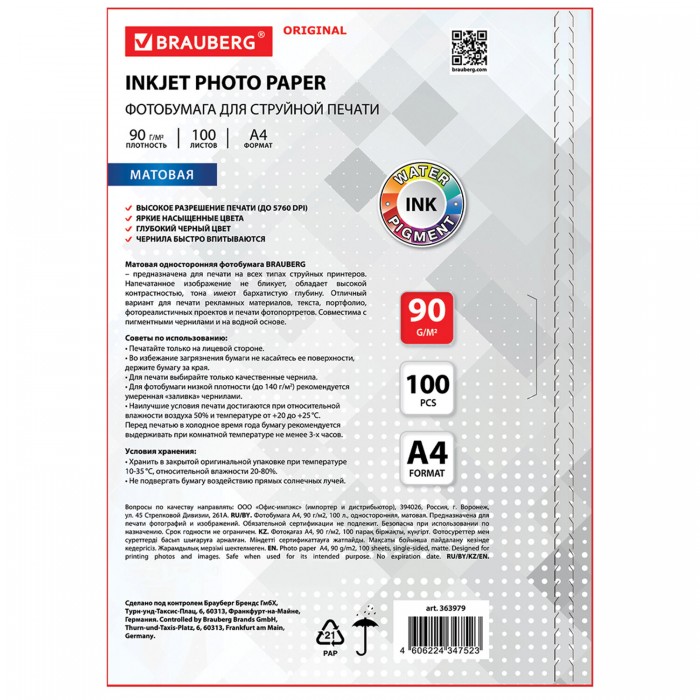 Фотобумага матовая, А4, 90 г/м2, односторонняя, 100 листов, BRAUBERG ORIGINAL, 363979