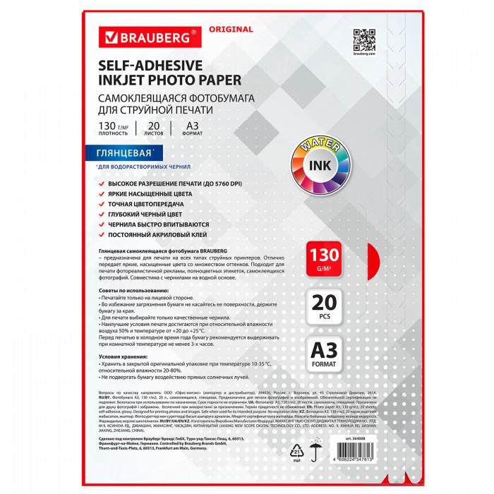 В интернет-магазине AV Group можно купить Фотобумага САМОКЛЕЯЩАЯСЯ глянцевая, А3, 130 г/м2, 20 листов, BRAUBERG ORIGINAL, 364008, производитель Китай, артикул 364008 по цене 683 руб. Продаем физическим и юридическим лицам, при условии минимальной суммы заказа (общей суммы в корзине) от 5 тысяч рублей. Возможна доставка курьером по Верхней Пышме, Екатеринбургу и Свердловской области. В регионы отправляем транспортной компанией. Чтобы уточнить необходимое количество товара и дополнительные условия, звоните: 8(800)201-75-47, менеджер вас проконсультирует.
