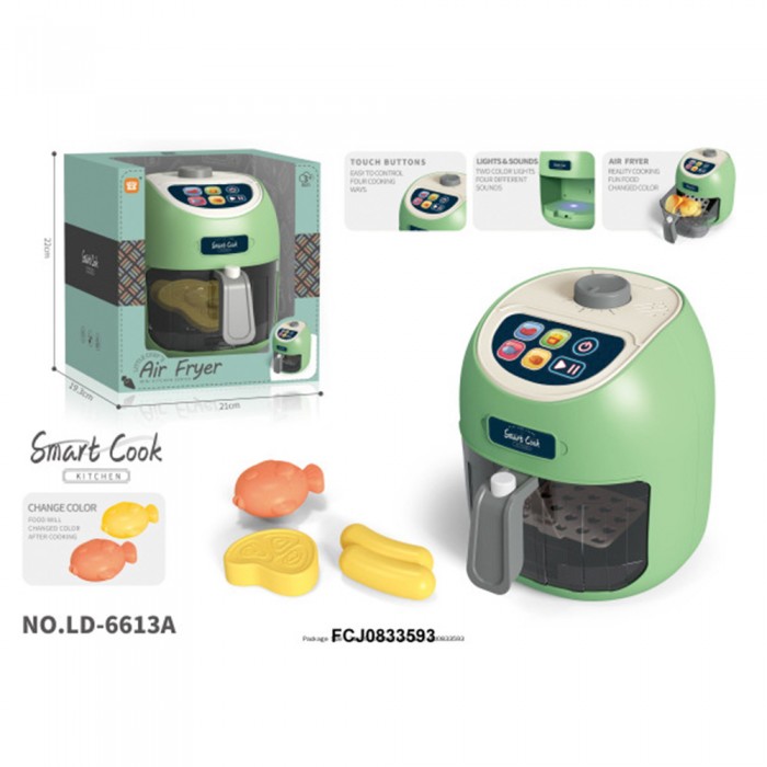 Размер упаковки: 21 х 19,5 х 22 см Размер изделия: 14,5 х 18 х 19 см Функционал: детская бытовая техника Вид упаковки: коробка Страна производитель: КНР Материал: полимеры Комплектация: фритюрница - 1 шт, игровые аксессуары - 3 шт Возраст ребенка: для детей от 3 лет Яркая интерактивная фритюрница станет отличным дополнением к ролевой игре, а с помощью аксессуаров игра станет интересной и реалистичной. Характеристики: - функция аэрогриля - после приготовления пища меняет цвет - простое управление - 4 режима - световые и звуковые эффекты - необходимы 3 батареи АА 1.5 V (не входят в комплект) - точная копия настоящей фритюрницы