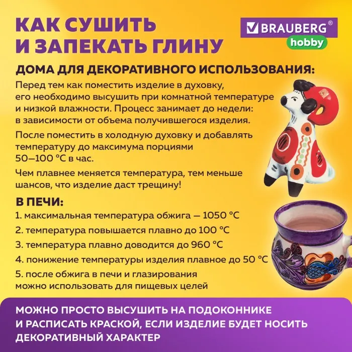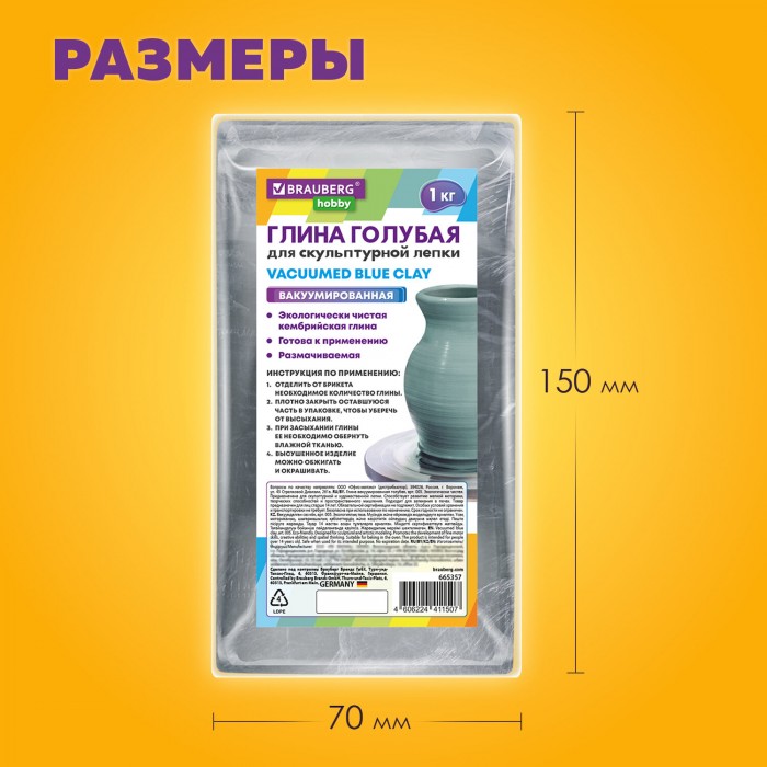 Экологически чистая кембрийская глина BRAUBERG HOBBY, добываемая в России на Чкаловском месторождении, идеально подойдет для художественной и скульптурной лепки. Способствует развитию мелкой моторики, творческих способностей и пространственного мышления.