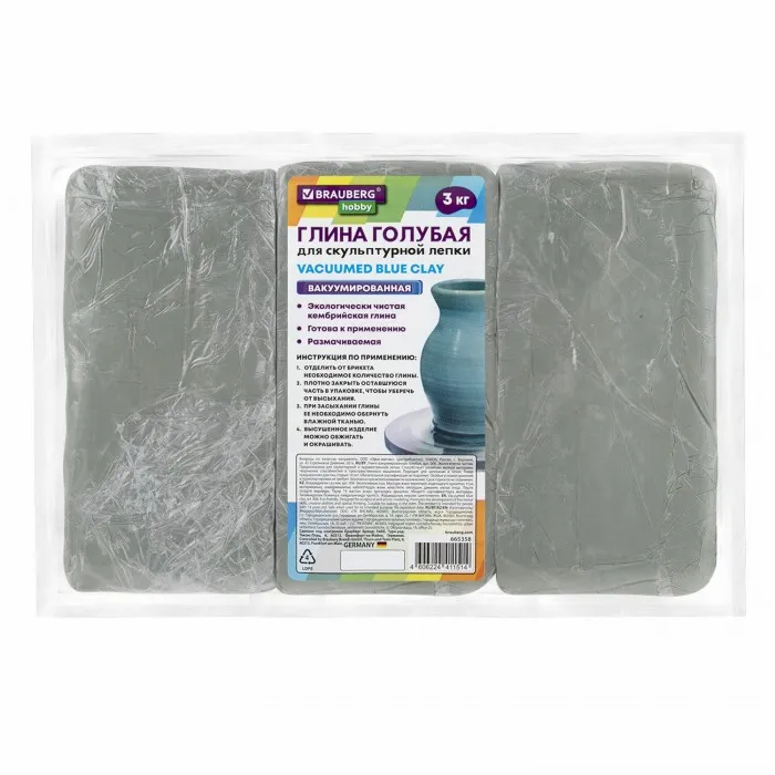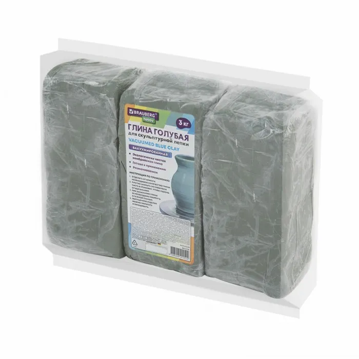 Глина для лепки голубая, 3 кг, вакуумированная, готовая, размачиваемая, BRAUBERG HOBBY, 665358