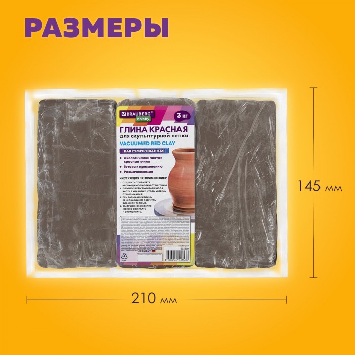 Глина для лепки красная, 3 кг, вакуумированная, готовая, размачиваемая, BRAUBERG HOBBY, 665360