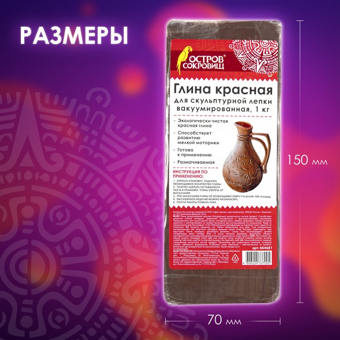 Экологически чистая красная глина ОСТРОВ СОКРОВИЩ идеально подойдет для скульптурной лепки, гончарного дела, набивки, формовки. Способствует развитию мелкой моторики, творческих способностей и пространственного мышления.