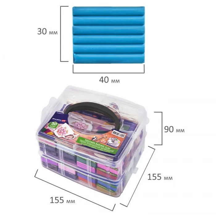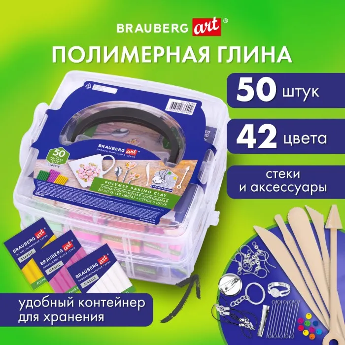 Глина полимерная запекаемая, НАБОР 50 штук (42 цвета) по 20 г, с аксессуарами в кейсе, BRAUBERG ART, 271166