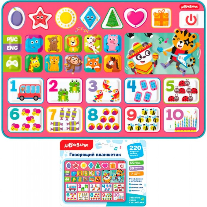 Размер упаковки: 28,6*22*2 см Размер изделия: 20,2*13,6*1,6 см Функционал: музыкальная игрушка Упаковка: блистер на картоне с подвесом Страна обладатель бренда: Россия Материал: пластик Комплектация: планшет - 1 шт. Возраст ребенка: от 3 лет Оригинальная музыкальная игрушка предназначена для активных игр и развития мелкой моторики и координации движений. Планшет оснащен кнопками, нажимая на которые малыш сможет услышать различные звуки и мелодии. Планшет содержит 220 вопросов, загадок и понятий, 7 игр и 10 веселых песенок. Игрушка учит пониманию причинно-следственной связи, помогает тренировать моторику и координацию движений, восприятие формы и цвета. Игрушка привлекает внимание и способствует развитию тактильного, зрительного и слухового восприятия малыша. Игрушки сделаны из прочного и безопасного материала. Тип питания: батарейки 3*ААА (в комплекте демонстрационные).