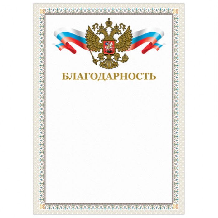 Грамота "Благодарность", А4, мелованный картон, конгрев, тиснение фольгой, бежевая рамка, BRAUBERG, 128346