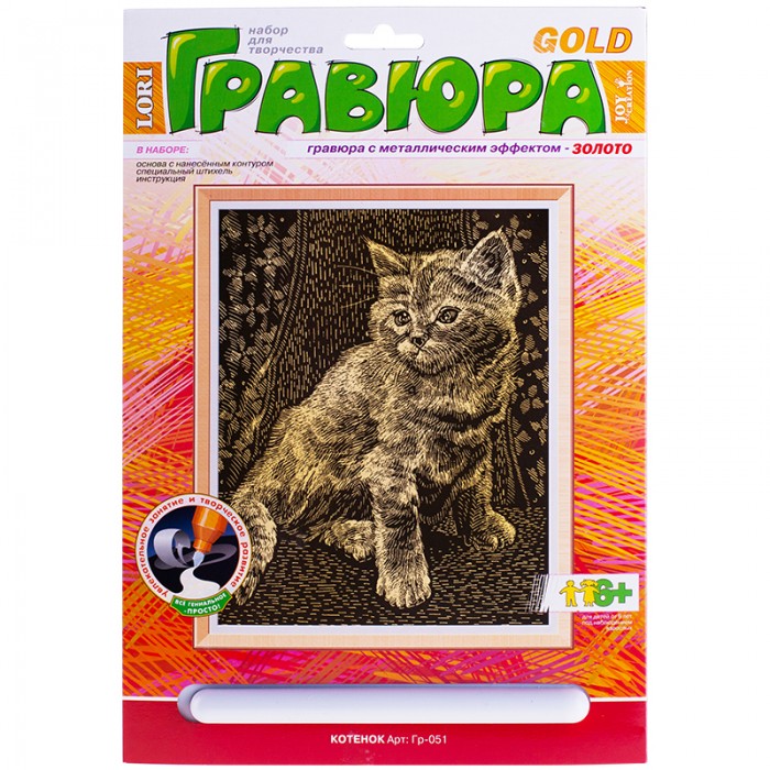 Контур рисунка уже нанесен на черный фон. С помощью специального штихеля изображение процарапывается, и из-под слоя краски появляется золотая основа. В результате получается контрастный рисунок. Комплектация: основа с контуром, штихель, инструкция. Упаковка: картонный пакет с европодвесом.