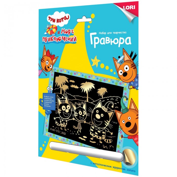 Процесс создания гравюры способен увлечь ребенка на длительное время. С помощью специального штихеля, которым нужно сцарапать верхний слой краски, из серого контура получается яркая золотая картинка с любимыми героями мультфильма «Три кота». Работа с гравюрой хорошо подходит для развития мелкой моторики и усидчивости, а также для правильной постановки руки ребенка при письме.