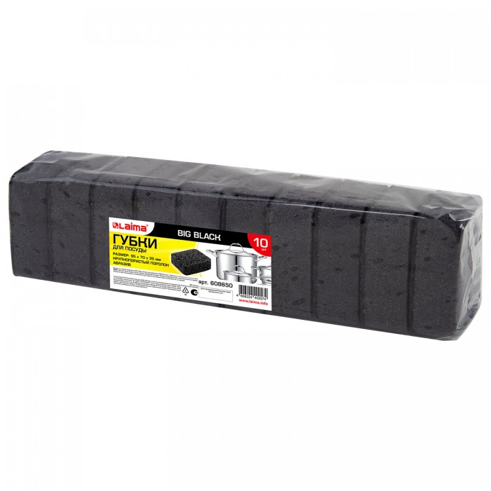 Губки для мытья посуды LAIMA BIG BLACK эффективно очищают и не оставляют царапин, мягкая сторона бережно отмоет любую поверхность, абразивный слой удаляет даже засохшие загрязнения. Размер: 95х70х35 мм. 10 штук. Цвет: черный.