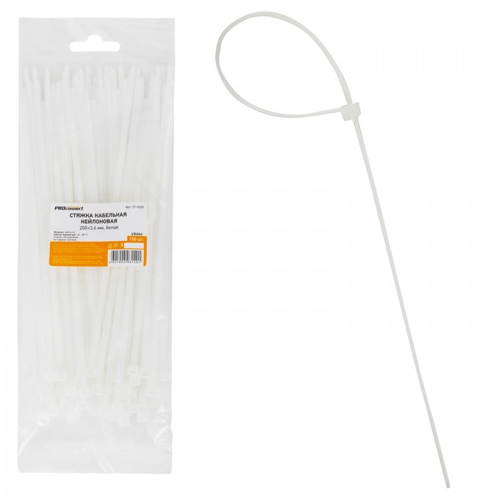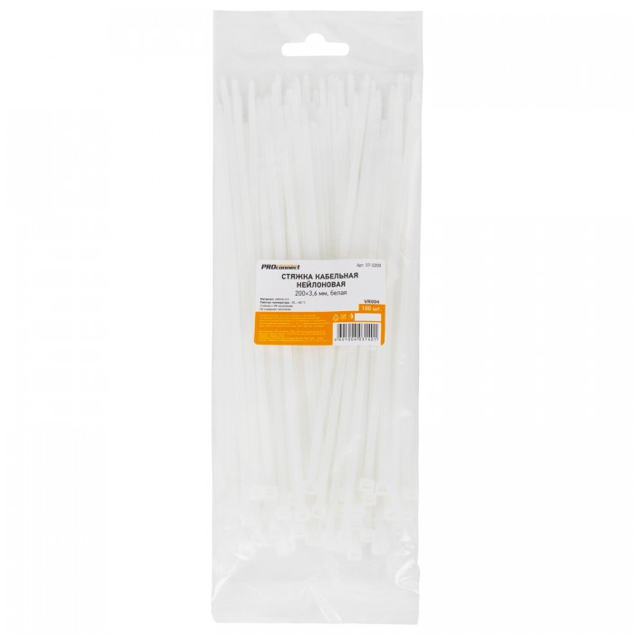 Хомуты (стяжки) нейлоновые, 3,6 мм х 200 мм, комплект 100 шт., белые, европодвес, 57-0200