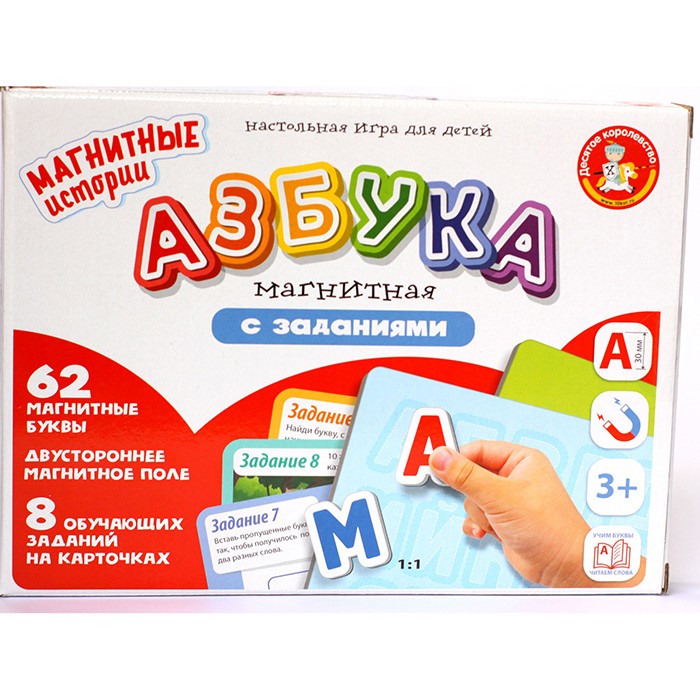Комплектация: двустороннее магнитное поле, 62 магнитные буквы, 8 заданий на карточках Материал: картон, магнит Упаковка: картонная коробка Размер упаковки: 25*18,5*2,7 см Возраст: 6+ Страна обладатель бренда: Россия Красочная и яркая настольная игра - прекрасный способ весело и с пользой провести время с друзьями и в кругу семьи. Игра поможет малышу познакомиться с буквами русского алфавита и начать осваивать чтение. Красивые элементы привлекут внимание ребенка. Оригинальная игра поможет интересно провести время. Настольная игра направлена на развитие логического мышления, коммуникативных навыков, умения манипулировать мелкими предметами. Все элементы игры выполнены из качественных и прочных материалов, окрашены безопасными нетоксичными красками, устойчивыми к износу и выгоранию.