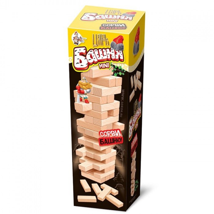 Размеры: 7*7*19 см Вес: 371 г. Возраст: от 5 лет Эта игра отличается от «Царь башни» артикул 02792 только размером брусочков - они меньше. Поэтому от игроков потребуется еще большая сноровка и аккуратность. Участвовать в этой веселой игре могут от 2 до 10 игроков возрасте от 5 до 99 лет, время игры от 5 до 20 минут. В комплект «Царь башня Mini» входят: - деревянные неокрашенные брусочки, размером 60х10х20 мм - 54 шт; - уголок для сборки башни - 1 шт. Из брусков надо сложить ровную башню, используя специальный уголок, входящий в комплект игры. В каждом ряду должно быть три бруска, каждый последующий ряд складывается в направлении, поперечном предыдущему. Таких рядов должно получиться 18! Затем надо аккуратно перевернуть башню. Уголок поможет башне не упасть и сохранить свою форму. На столе окажется высокая восемнадцатиэтажная неприступная башня. Каждый игрок, в свою очередь, вынимает из башни один брусок, причем это нужно делать одной рукой. Этот брусок, оказавшийся в руках игрока, укладывается на но