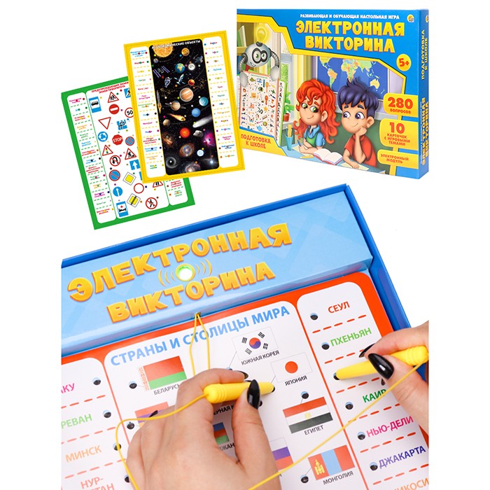 Размер упаковки: 25*39*4 см Функционал: настольная игра, викторина Упаковка: картонная коробка Страна обладатель бренда: Россия Материал: картон, пластик Комплектация: электронный модуль, карточки - 10 шт., правила Возраст ребенка: от 7 лет • Настольная игра позволит весело и интересно провести совместный досуг с друзьями и в кругу семьи. • Красочные элементы привлекут внимание ребенка. • Викторина содержит сведения об окружающем мире - 280 вопросов. • Электронный модуль подскажет, верно ли ребенок отвечает на вопросы. • Оригинальная настольная игра поможет весело и интересно провести время. • Такие игры помогут закрепить и проверить полученные знания, узнать новые интересные факты, сразиться в соревновании на эрудицию. • Игра может использоваться индивидуально или в детском коллективе, при проведении тематических занятий • Настольная игра направлена на развитие мышления, памяти, расширение кругозора. • Все элементы игры выполнены из качественных и прочных материалов, окрашенн