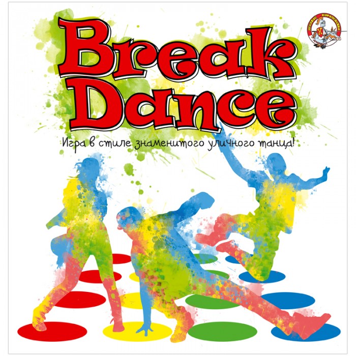 Брейк Данс представляет собой большое игровое поле из полиэтиленовой пленки размером 1,2х1,8 метра. Поле размечено четырьмя рядами цветных кругов. В каждом ряду их по шесть штук – желтого, красного, зеленого и синего цветов. К игре прилагается рулетка, которая представляет собой круг из прочного картона, поделенный на 4 секции: левая и правая рука, левая и правая нога. В каждой секции по 4 круга – синего, зеленого, желтого и красного цвета. На одном поле может играть от 2-х до 4-х игроков, для большего количества участников потребуется несколько полей, которые необходимо сложить вместе.