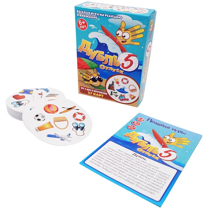 Размер упаковки: 15,5 х 11 х 3,7 см Диаметр карточек: 8,6 см Вид упаковки: картонная коробка Страна производитель: Россия Материал: картон Комплектация: 57 круглых карточек Вес: 140 гр. Возраст ребенка: от 6 лет Занимательная настольная игра «Дубль 5. Отпуск» отличный вариант для проведения веселого вечера с друзьями или в кругу семьи! Цель игры: находить один общий предмет на двух разных круглых карточках. Игра тренирует реакцию, внимательность и логическое мышление.