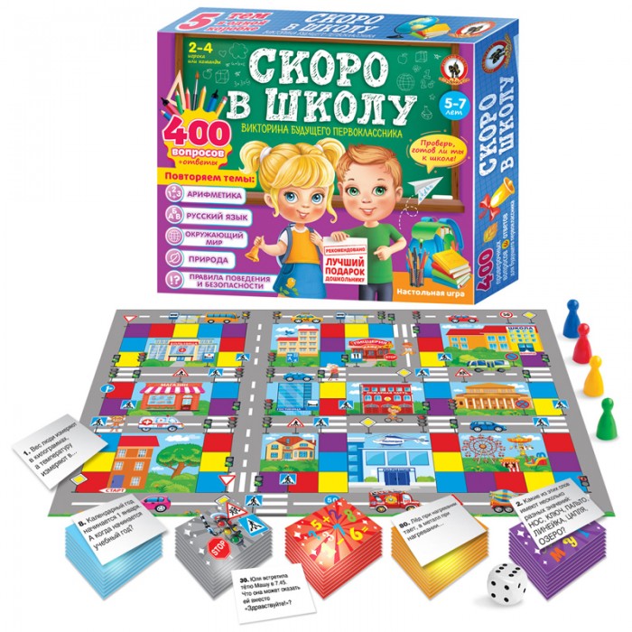 Эта развивающая викторина поможет в занимательной игровой форме проверить знания будущего первоклассника по математике, окружающему миру, русскому языку, правилам поведения и безопасности, и выяснить, нет ли в них пробелов, которые необходимо восполнить. Играя, дети повторят такие важные темы, как порядковый счёт, цифры, числа, сложение и вычитание, сравнение чисел, геометрические фигуры и формы, буквы, слоги, предлоги, обобщающие слова, живая и неживая природа, растения и животные, календарные месяцы, правила безопасности, правила дорожного движения, правила поведения в школе и по дороге к школе, повторят важную тему «Наша Родина» и многое другое, что необходимо знать к первому классу. Эта игра будет отличным подарком будущему первокласснику! В комплект игры входит игровое поле, 400 карточек с вопросами, 4 фишки, кубик и правила. Игра рассчитана на 2-4 игроков или 2-4 команды и предназначена для детей в возрасте от 5 до 7 лет. Два варианта игры позволяют эффективно использовать её как дома, так и в дошкольных учреждениях.