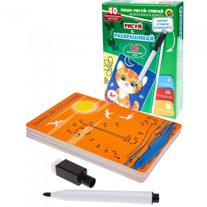Размер упаковки: 15,9 х 11,9 х 3,4 см Вид упаковки: картонная коробка Страна производитель: Россия Материал: картон, пластик Комплектация: 40 многоразовых карточек, маркер с губкой Вес: 215 гр. Возраст: 4+ Карточки с маркером «Рисуй и раскрашивай» от ТМ «Рыжий кот» - это развивающий набор для малышей дошкольного возраста. На карточках представлены интересные задания, которые развивают логическое мышление, внимание, память и мелкую моторику. Благодаря компактному размеру упаковки, карточки можно брать с собой в дорогу и в путешествие.