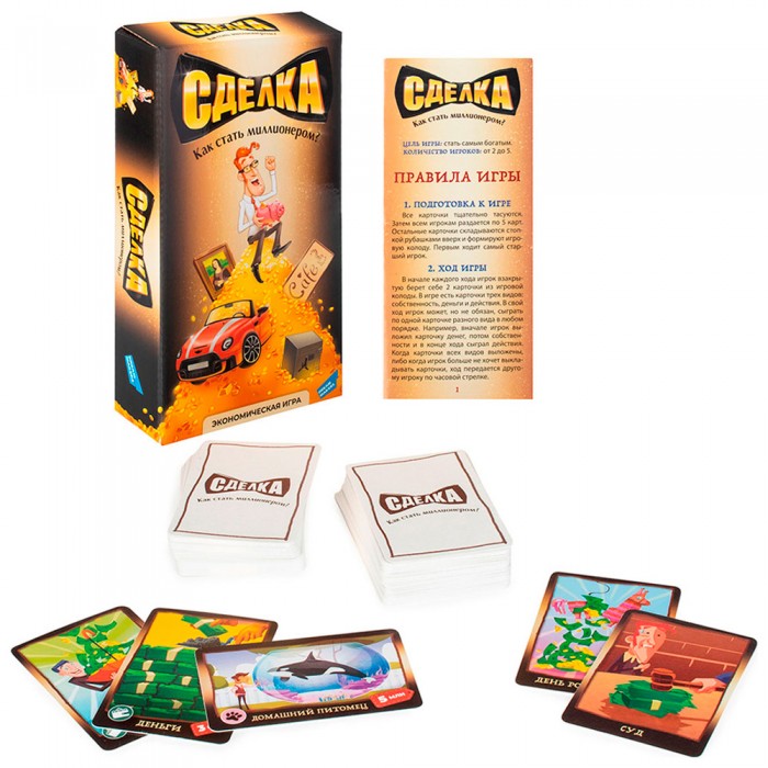 Размер упаковки: 18*10,5*3,5 см Вес: 150 г Функционал: настольная игра, экономическая, стратегическая Упаковка: картонная коробка Страна обладатель бренда: Беларусь Материал: картон Комплектация: карточка - 100 шт., правила Возраст ребенка: от 5 лет Красочная и яркая настольная игра - прекрасный способ весело и с пользой провести время с друзьями и в кругу семьи. Покупай острова, машины и предметы искусства, подставляй соперников или просто откладывай деньги в банк. Твоя цель - стать самым богатым. Успей заключить свою самую выгодную сделку. Красивые иллюстрации привлекут внимание ребенка. Оригинальная настольная игра поможет весело и интересно провести время. Настольная игра направлена на развитие логического и стратегического мышления, коммуникативных навыков, умения принимать совместные решения. Все элементы игры выполнены из качественных и прочных материалов, окрашены безопасными нетоксичными красками, устойчивыми к износу и выгоранию.