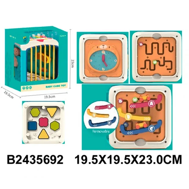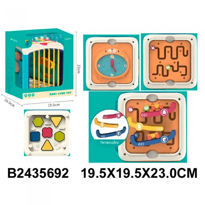 Размер упаковки: 19,5 х 19,5 х 23 см Размер изделия: 15 х 15 х 15 см Функционал: игрушки для малышей, логические игрушки Вид упаковки: картонная коробка блистерного типа Страна производитель: КНР Материал: полимеры Комплектация: куб - 1 шт, разноцветные фигуры - 8 шт, скользящие рельсы - 3 шт Возраст ребенка: для детей от 12 месяцев Игрушка логический куб для сенсорного развития малыша: - выполнена из безопасных и качественных материалов - двусторонняя верхняя часть: с одной стороны, часы с подвижными стрелками, с другой игра лабиринт - в комплекте набор скользящих рельс для игры лабиринт - в нижней части куба отверстия для фигур - размер фигур: 3,5 см - одна из сторон сделана из качественной веревки, для игры с фигурами