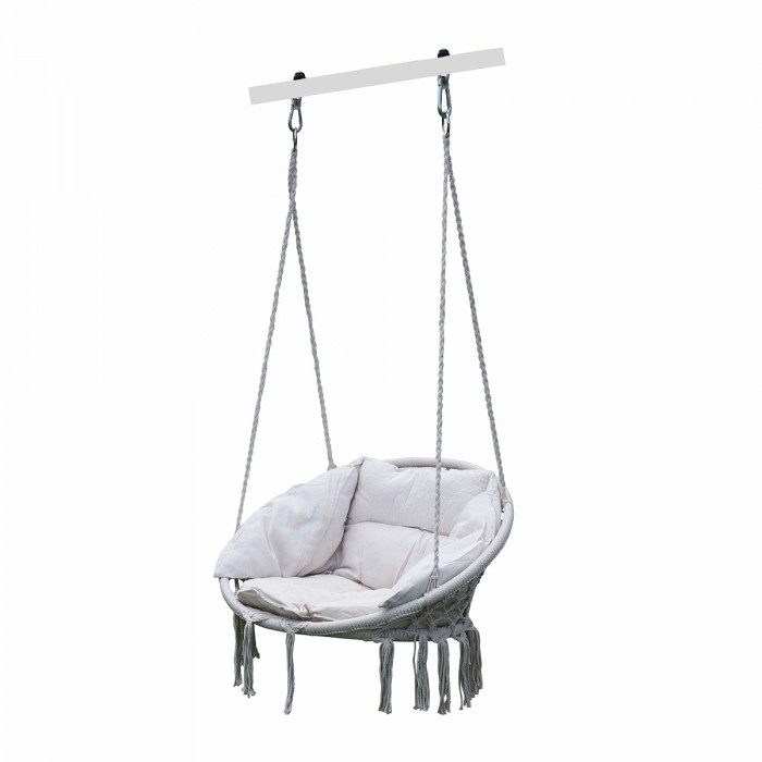 Мягкое и удобное сиденье со спинкой изготовлено из 100% хлопка. Натуральная ткань имеет высокие воздухопроницаемые и влаговпитывающие свойства, устойчива к износу, на ней будет комфортно сидеть или качаться даже в жаркий летний день.