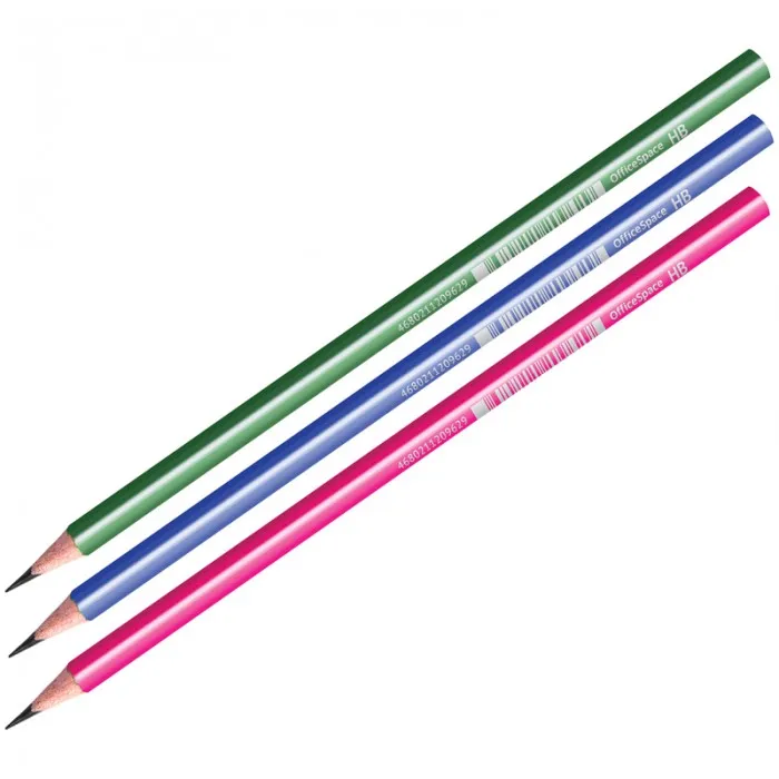 Пластиковый чернографитный карандаш. Полосатый корпус ассорти (зеленый, синий, красный). Твердость HB. Заточенный.