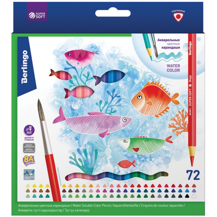 Карандаши акварельные Berlingo "SuperSoft. Рыбки", 72цв.+кисть, трехгран., заточен., картон, европодвес