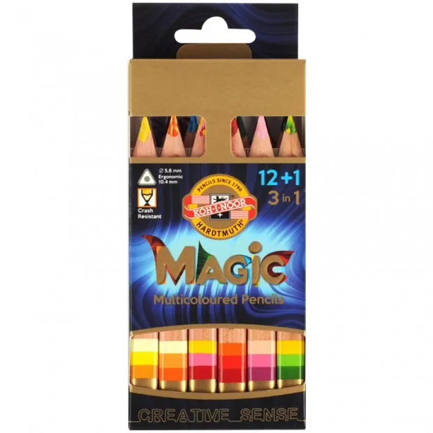 Карандаши многоцветные Koh-i-Noor Magic – это набор из 12 карандашей плюс карандаш-блендер. Чем они интересны? Тем, что грифель смешан из трех цветов. Линия на бумаге меняет свой цвет в процессе рисования и раскрашивания, что позволяет получать совершенно неожиданные и никогда не повторяющиеся рисунки. В наборе есть карандаш-блендер, при помощи которого можно растушевывать рисунки, смягчать границы переходов цвета. Карандаши мягкие и не требуют сильного надавливания при рисовании. Koh-i-Noor Magic давно стали популярными не только у детей, но и у профессиональных художников. В комплект набора также включены ластик и точилка.