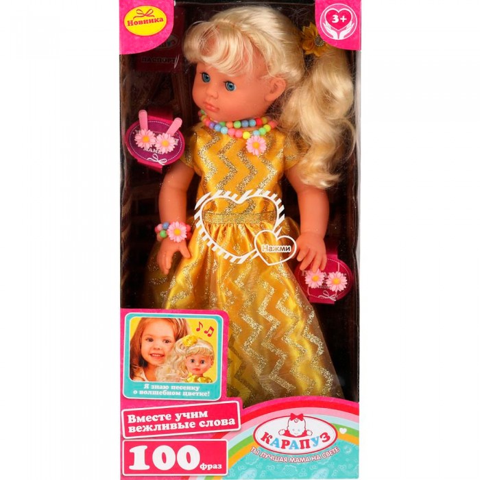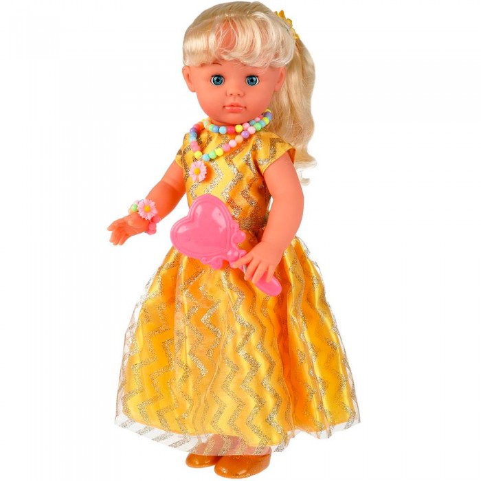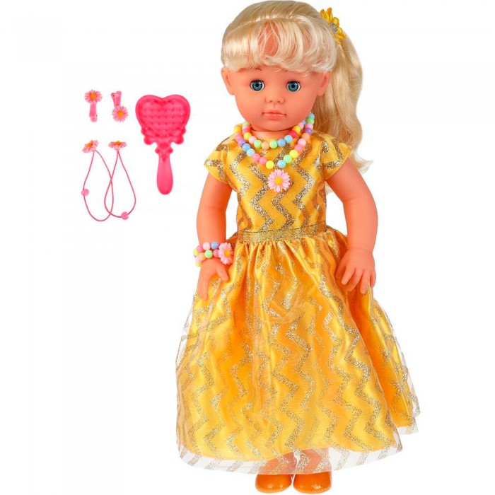 Размер упаковки: 23 х 12 х 48 см Размер изделия: 45 см Функционал: кукла озвученная Упаковка: картонная коробка с дисплеем Страна обладатель бренда: Россия Материал: пластик, текстиль, винил Комплектация: кукла - 1 шт., платье - 1 шт., туфли - 1 пара, расческа - 1 шт., заколка - 2 шт., резинка - 2 шт. Возраст ребенка: от 3 лет Нарядная стильная кукла станет замечательным подарком для девочки. Особенности: - можно переодевать и причесывать; - подвижные руки, ноги, голова; - одежда снимается; - прошитые волосы из нейлона похожи на натуральные; - глаза закрываются; - 2 песни; - 3 стихотворения; - 2 скороговорки; - 2 загадки; - 100 фраз; - учим вежливые слова, быть аккуратными и помогать маме; - работает от 3 батареек LR44 (в комплекте); - безопасные материалы: туловище и ноги из пластмассы, руки и голова из винила. Игры с куклами развивают: - тактильные ощущения; - зрительное восприятие; - мелкую моторику; - воображение.