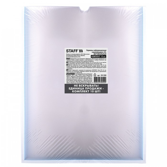Карманы информационные самоклеящиеся, А4, вертикальные, КОМПЛЕКТ 10 шт., ПЭТ, 0,3 мм, STAFF, 291280