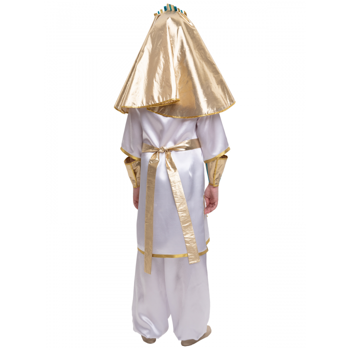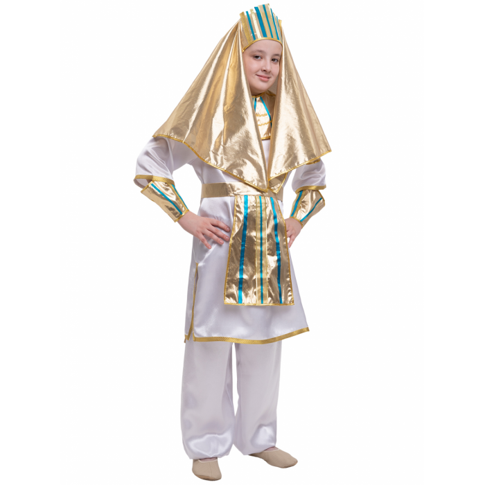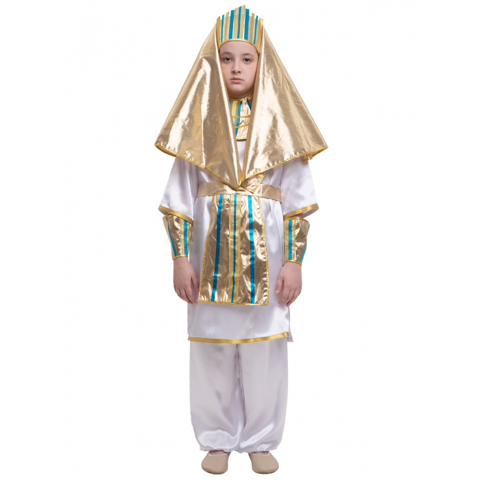 Парча (100% полиэстер) Текст на этикетке: Рекомендуется для детей старше 3-х лет для кратковременного ношения. Срок службы 5 лет при аккуратном ношении. Способ ухода за изделием: ручная стирка при температуре 30 С° с применением нейтральных моющих средств. Не отжимать. Не сушить в машине. Гладить при низкой температуре. Карнавальный костюм Фараон - настоящее творение искусства. Костюм выполнен из белого атласа (крепсатина) и золотой парчи. Балахон украшен золотой тесьмой. Нарукавники, клафт (головной убор) и воротник сложного кроя выполнены из парчи и украшены лентами, имитирующими инкрустацию. Широкие шары-шаровары собраны на поясе на резинку.