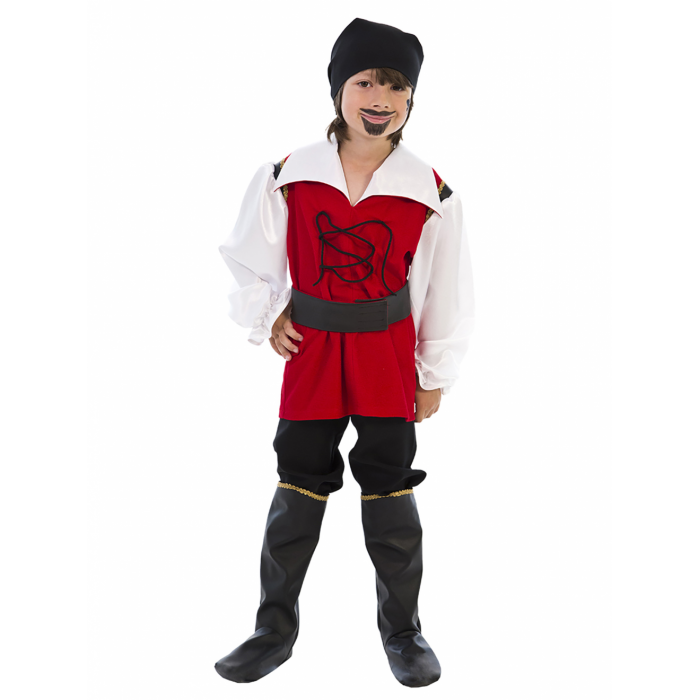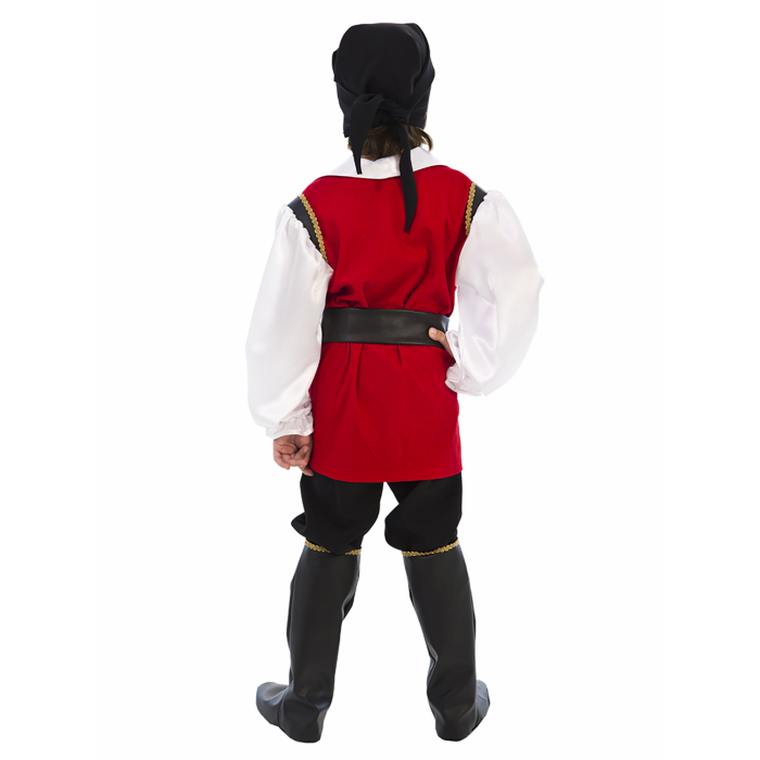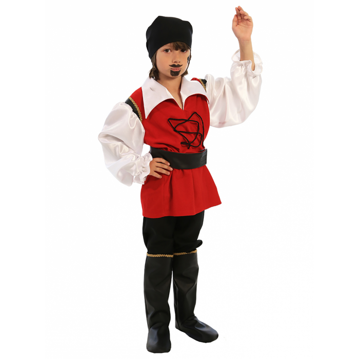 Кожзаменитель Текст на этикетке: Рекомендуется для детей старше 3-х лет для кратковременного ношения. Срок службы 5 лет при аккуратном ношении. Способ ухода за изделием: ручная стирка при температуре 30 С° с применением нейтральных моющих средств. Не отжимать. Не сушить в машине. Гладить при низкой температуре. Карнавальный костюм Корсар состоит из рубахи, брюк, банданы и пояса. Рубаха зашнуровывается на груди. Низ брюк, выполненных из крепсатина, имитирует сапоги. Костюм Корсара разработан для детских костюмированных мероприятий, театральных постановок. Костюм Корсара можно использовать как костюм Пирата.