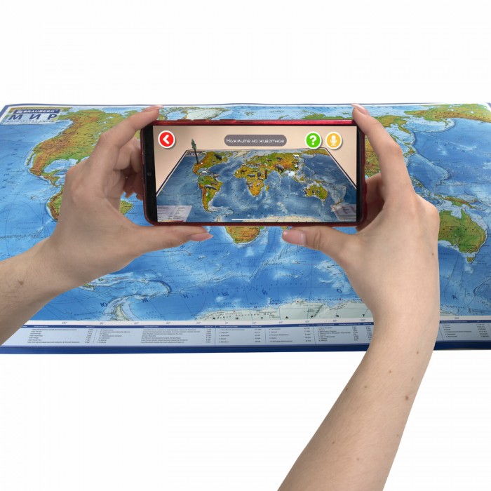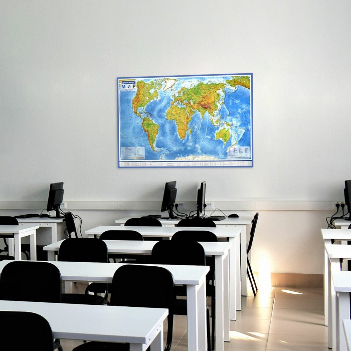 На географической карте мира BRAUBERG отображаются названия континентов, океанов и морей, рек, гор, течений.