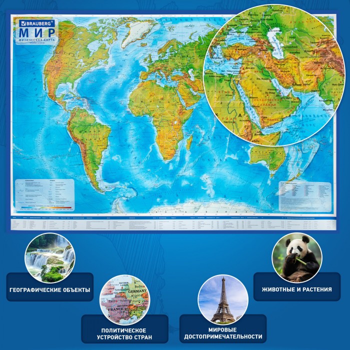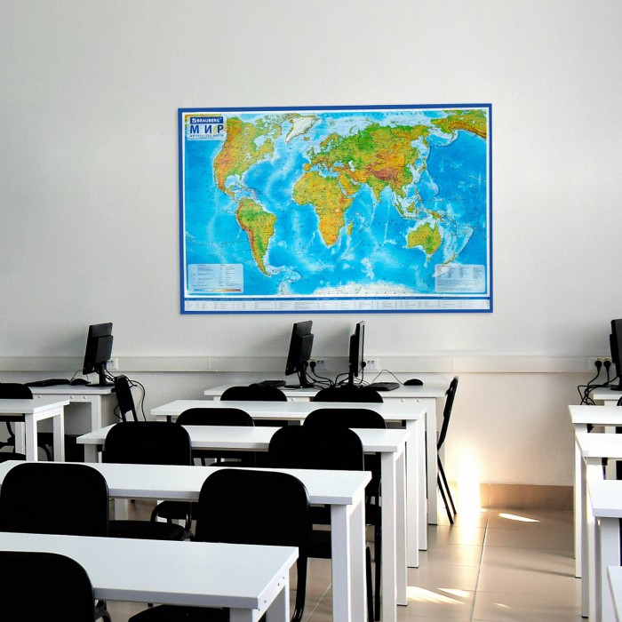 На географической карте мира BRAUBERG отображаются названия континентов, океанов и морей, рек, гор, течений и т. д.