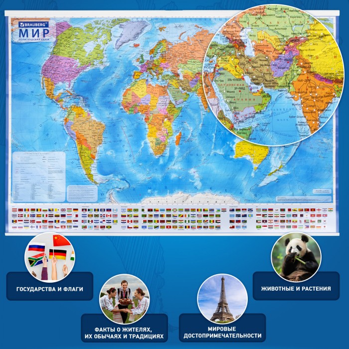 На политической карте мира BRAUBERG отображается современное политико-административное устройство мира: названия государств и их столицы, крупнейшие города и границы стран. Ниже расположены государственные флаги.