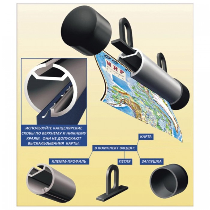 Карта отличается удобством использования. В комплект входят: карта, клемм-профиль (пластиковые рейки), заглушки к рейкам, петли, тубус. Предназначена для размещения в офисах, школах, средних и высших учебных заведениях, а также в кабинетах руководителей.