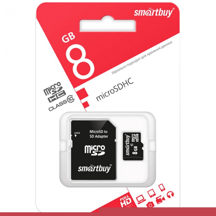 Карта памяти SmartBuy MicroSDHC 8GB, Class 10, скорость чтения 10Мб/сек (с адаптером SD)