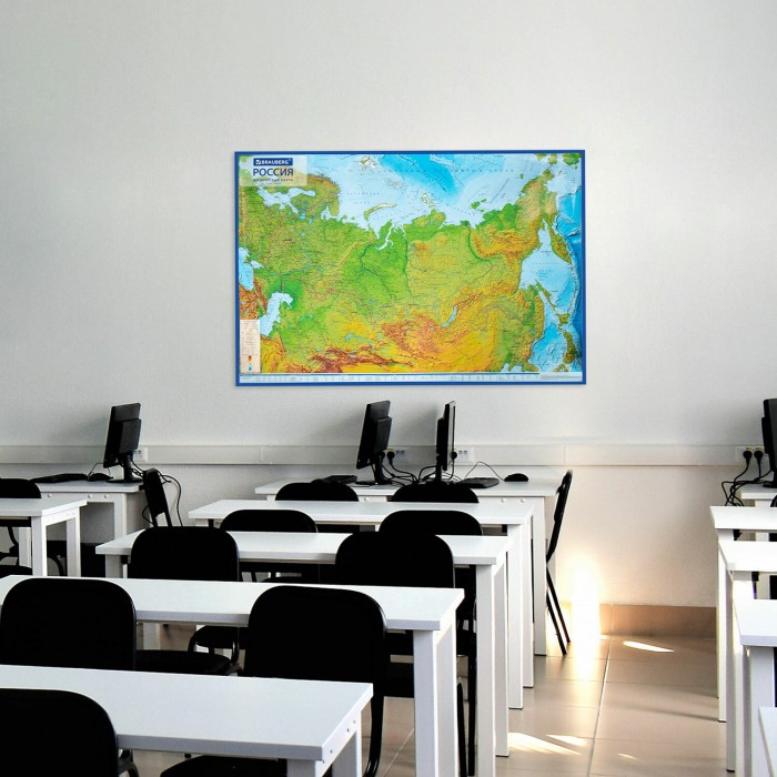 На физической карте России BRAUBERG отображаются названия рек и морей, городов и областей, гор и вулканов.