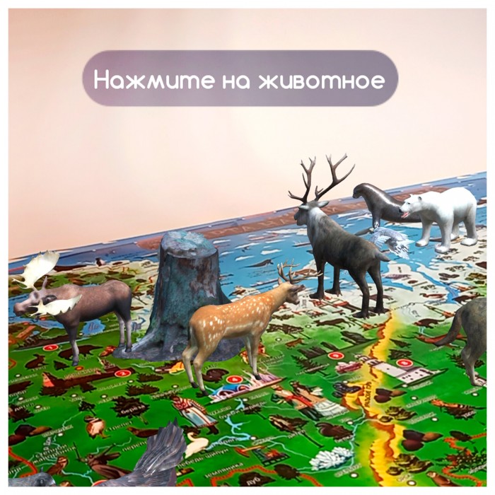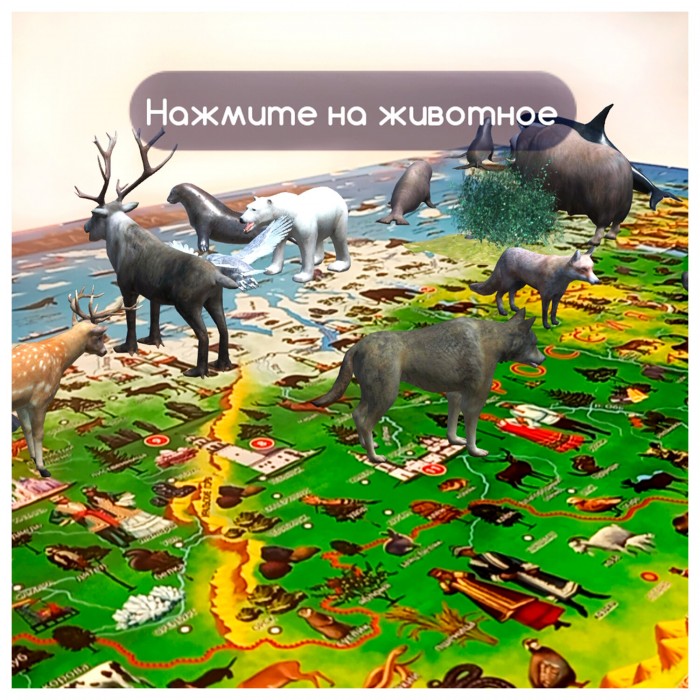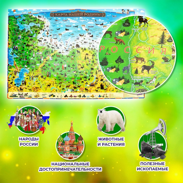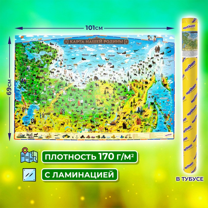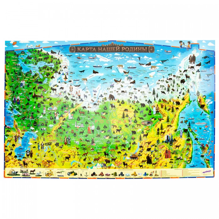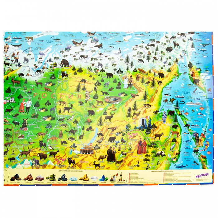 Интерактивная карта ЮНЛАНДИЯ с обозначениями наиболее распространенных животных, растений и народов России. Плотная бумага с двусторонней капсульной ламинацией устойчива к воздействию окружающей среды.