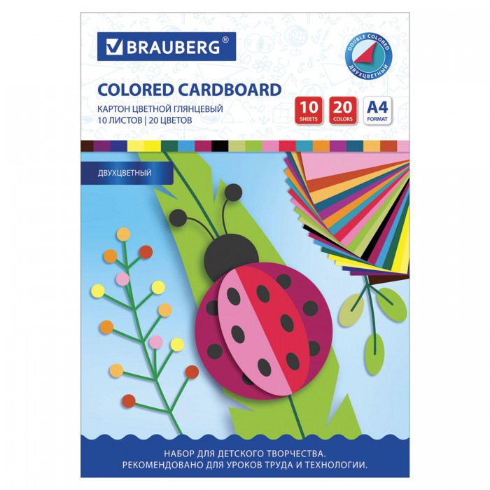 Картон цветной А4 2-цветный МЕЛОВАННЫЙ, 10 листов, 20 цветов, в папке, BRAUBERG, 200х290 мм, 113553