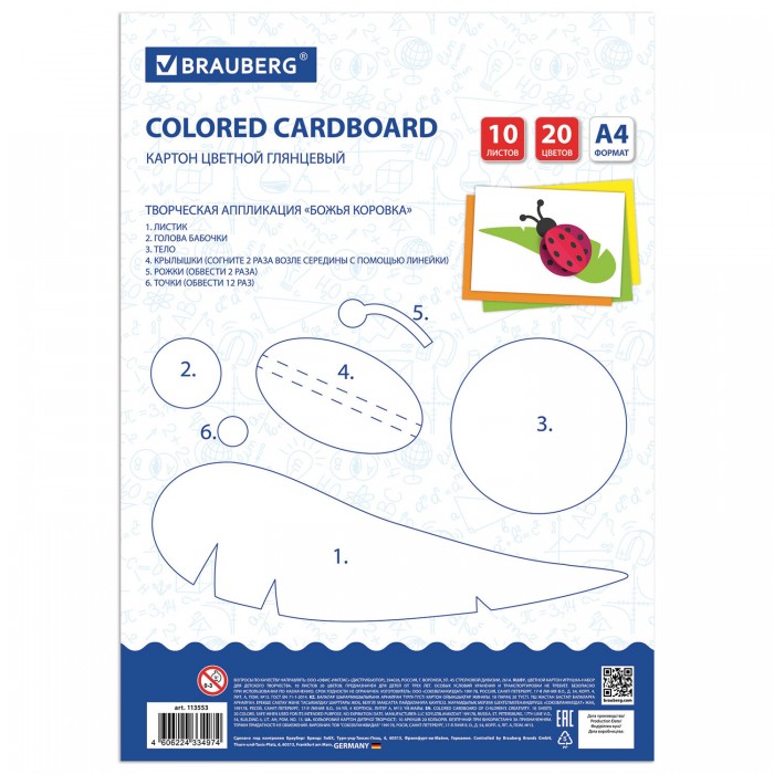 Набор цветного картона BRAUBERG предназначен для творчества и хобби и может использоваться детьми с трехлетнего возраста. Картон рекомендован для уроков труда и технологии. Творческая инструкция по созданию аппликации на обороте.