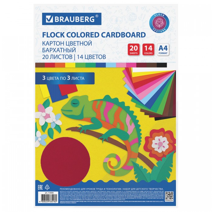 Картон цветной А4 БАРХАТНЫЙ, 20 листов 14 цветов, 180 г/м2, BRAUBERG, 113505