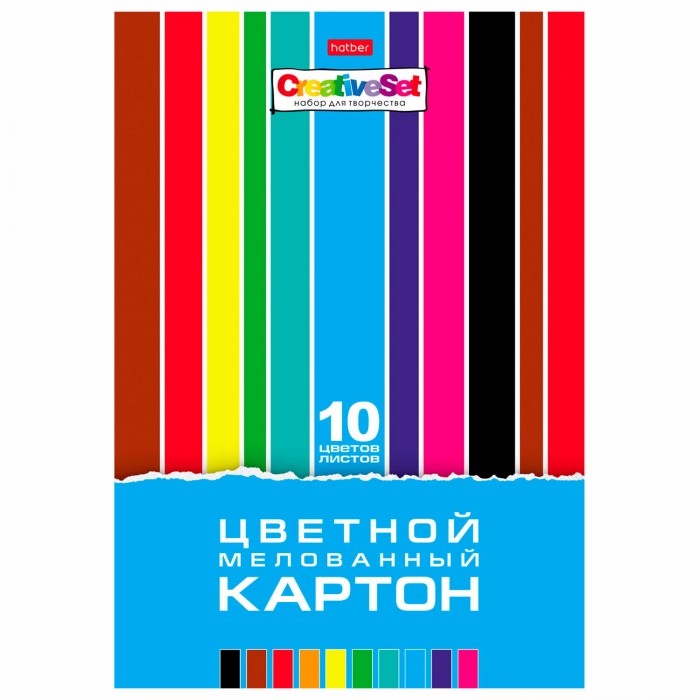 Картон цветной А4 МЕЛОВАННЫЙ, 10 листов 10 цветов, в папке, HATBER, 195х280 мм, "Creative", 10Кц4 05809, N049600