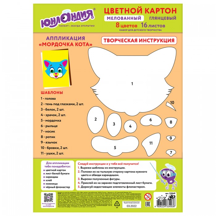 Набор цветного картона ЮНЛАНДИЯ предназначен для творчества и хобби и может использоваться детьми с трехлетнего возраста. Картон рекомендован для уроков труда и технологии. Творческая инструкция по созданию аппликации на обороте.