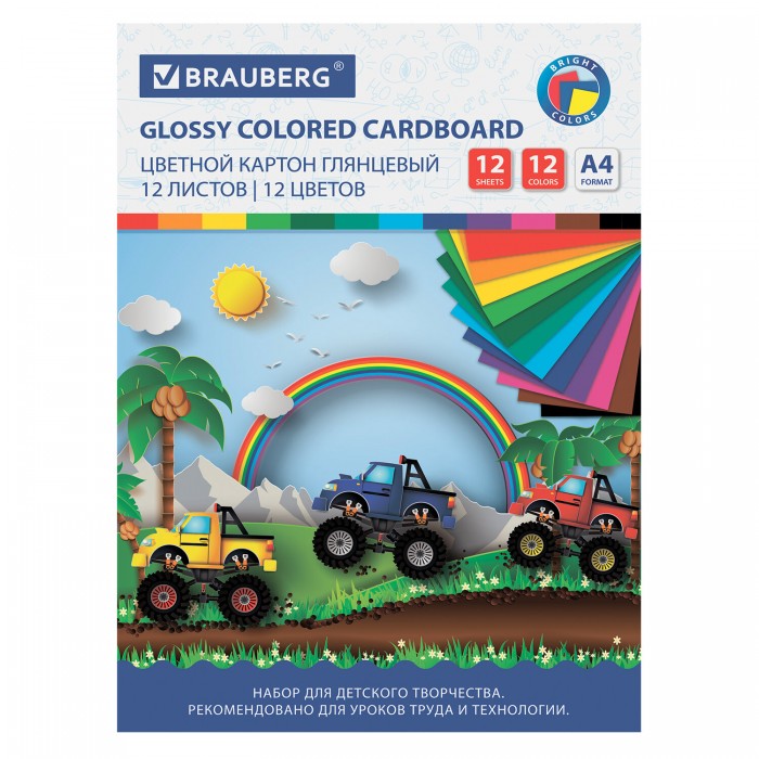 Картон цветной А4 МЕЛОВАННЫЙ (глянцевый), 12 листов 12 цветов, в папке, BRAUBERG, 200х290 мм, "Гонки", 129916